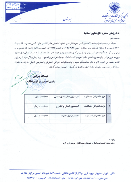 ماده 19) هزینه های کارشناسی و مترتبه برای رسیدگی به شکایات در کمیسیون ها و انجمن نظارت و نحوه هزینه کرد بر اساس جدول تعرفه ای است که بصورت سالانه و بر اساس عرف معمول به تصویب انجمن نظارت رسیده و جهت اجراء ابلاغ می گردد. مستند پرداخت هزینه های فوق به حساب اتاق تعاون مربوطه هنگام تسلیم و ثبت شکایت و اعتراض( از معترض یا معترضین). بعنوان مستندات پرونده در سامانه ثبت شکایت بارگذاری می گردد.